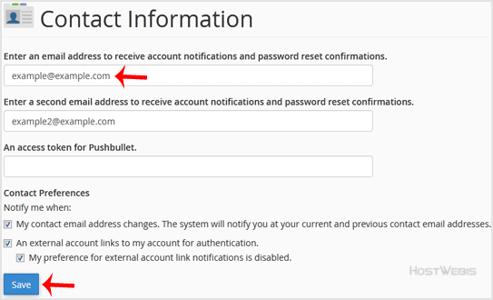 If you want to receive a notification on reaching your disk quota, bandwidth usage limit, reaching email disk quota, or wish to update your cPanel contact information, follow these steps.