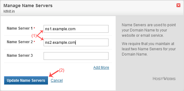 Note: For your current nameservers, you need to check your HostWebis Welcome E-mail. In case you lose it, contact us, and we will be happy to help you. It may take anywhere from 12 to 24 hours for the changes to take effect globally, and remember to clear all caches and reboot your router/internet/wifi if needed.