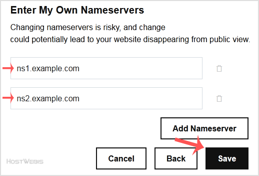 Note: For your current nameservers, you need to check your HostWebis Welcome E-mail. In case you lose it, contact us, and we will be happy to help you. It may take anywhere from 12 to 24 hours for the changes to take effect globally, and remember to clear all caches and reboot your router/internet/wifi if needed.