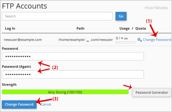 3. Under the FTP Accounts list, click on Change Password or use the Password Generator.