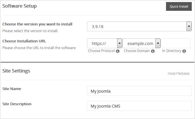 • Choose Installation URL: Choose the appropriate protocol/domain. Inside the "In Directory" field, should you want to install this in a directory, i.e. example.com/directory, enter the directory name. Otherwise, leave it blank to install in your main domain, i.e. example.com