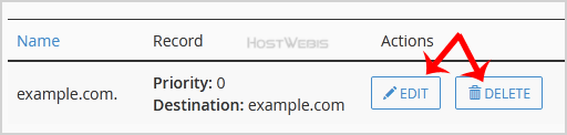 5. Locate CNAME Record that you wish to edit or remove. If you want to edit a CNAME record, click the Edit option, modify the details, and click on Save Record. Removing a record can be done with the Delete option.